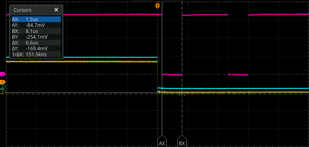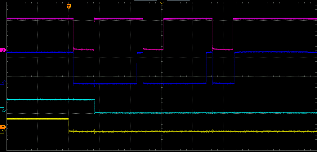 - ピンク:割り込みハンドラの先頭から、GINTの検出エッジ再設定まで (2V/div)