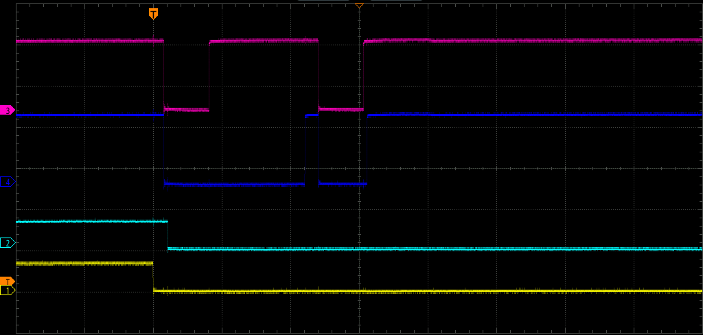 - ピンク:割り込みハンドラの先頭から、GINTの検出エッジ再設定まで (1V/div)